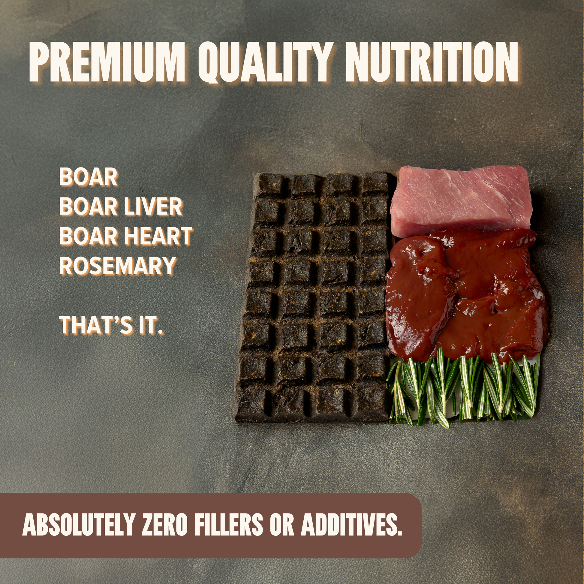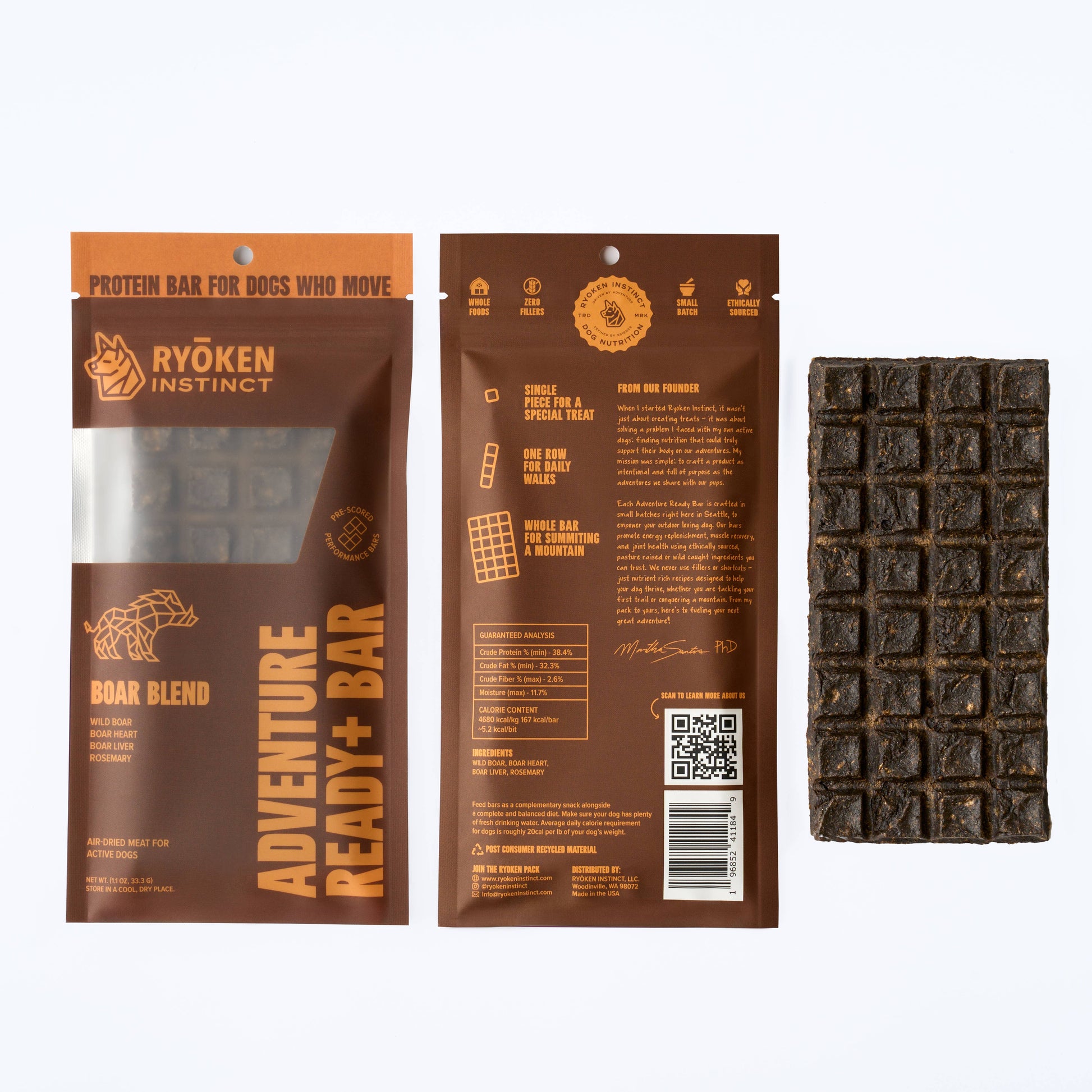 Fuel active dogs with Ryōken Instinct’s Boar Treat & Snack Bar - a performance-focused bar crafted to support energy, stamina, and recovery. Made with wild boar, boar heart, boar liver, and rosemary, it delivers nutrient-dense fuel for hikes, training days, and travel.